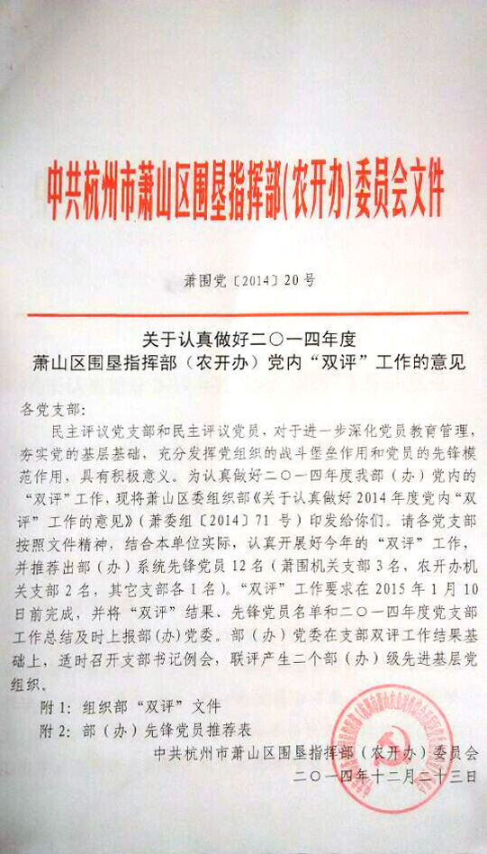 4.進行支部的年度蕭山區(qū)圍墾指揮部(農(nóng)開辦)先鋒黨員推薦。